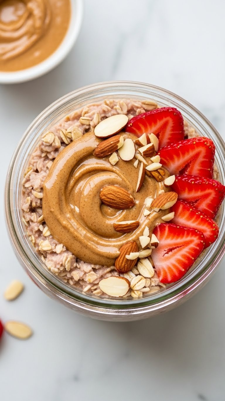 5. Strawberry Cheesecake Overnight Oats with Protein Powder and Almond Butter