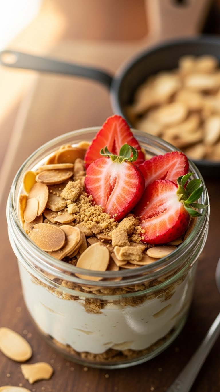 Sprinkle extra toasted almonds and a drizzle of honey. Add a few whole berries for color. Pair with latte or herbal tea. Store in fridge up to 3 days. Prepare almonds in advance for quick assembly.