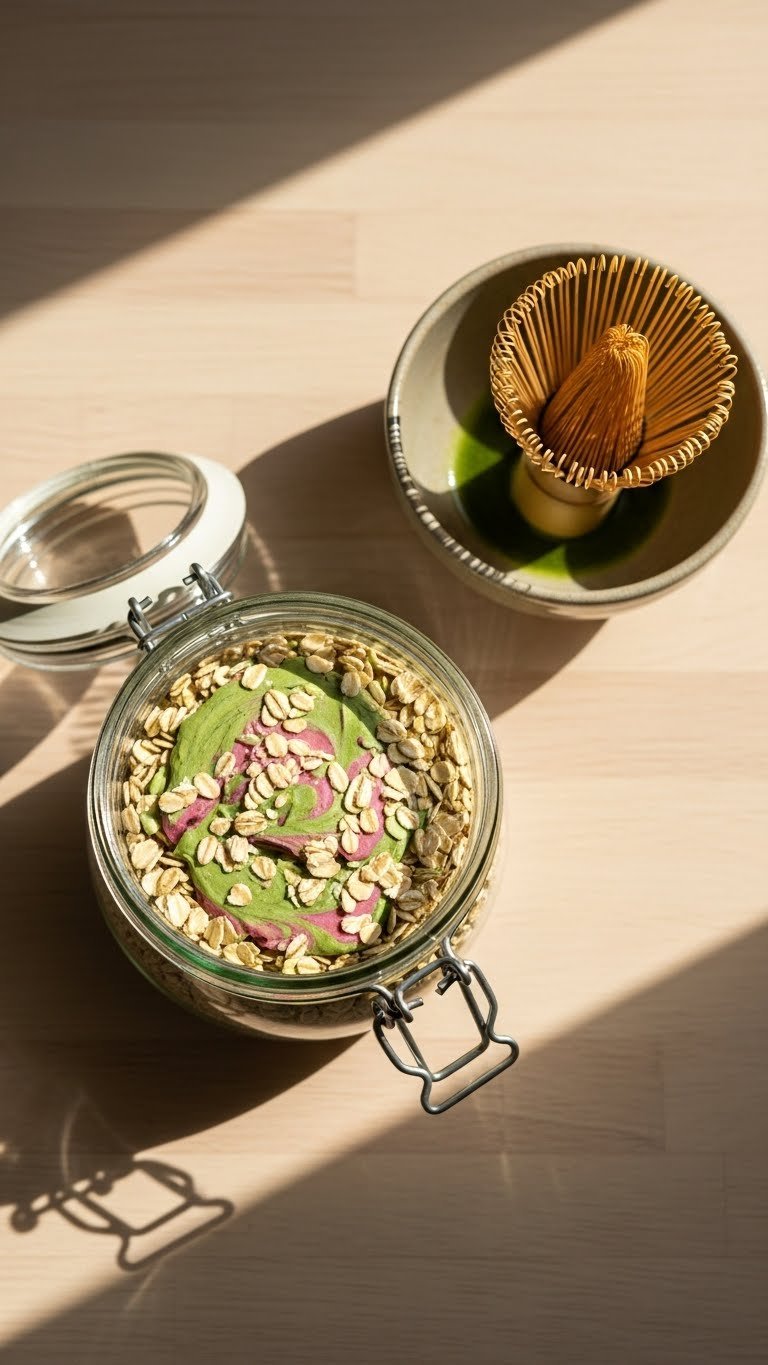 Garnish with a light dusting of matcha and sliced strawberries. Pair with a small matcha latte to intensify flavors. Store jars in fridge up to 3 days. Make single-serve jars for morning focus.
