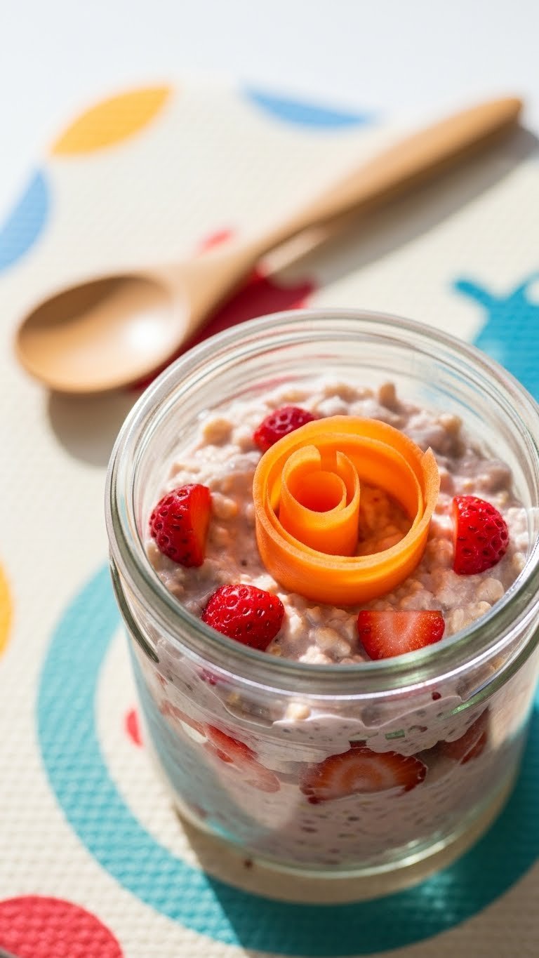 Top with a few whole berries and a thin carrot ribbon for fun. Pair with a glass of milk or a mild fruit smoothie. Store jars in fridge up to 3 days. Prep jars for school lunches or quick breakfasts.