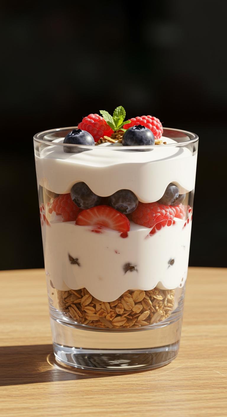 - In a glass, layer Greek yogurt, berries, and granola.