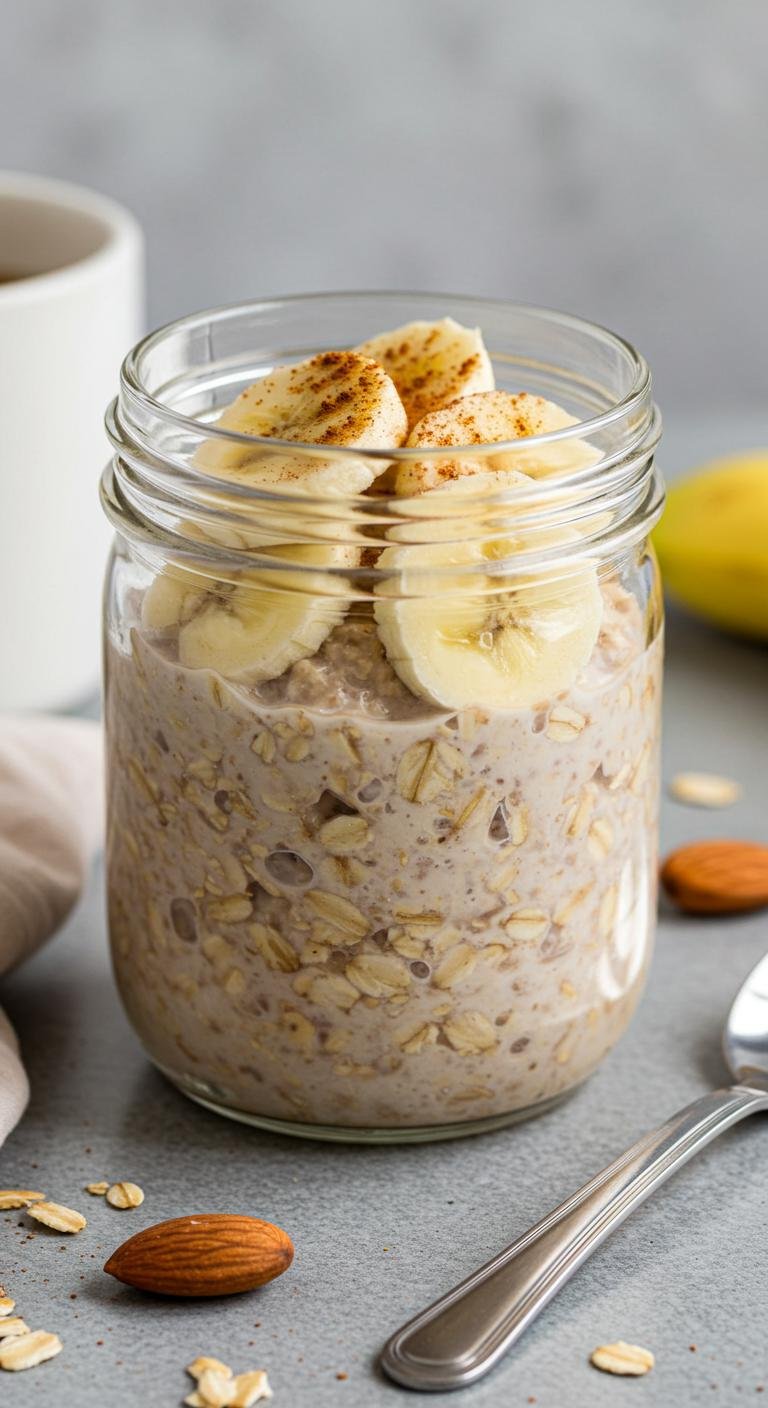 - Mix oats, almond milk, banana, and chia seeds in a jar.