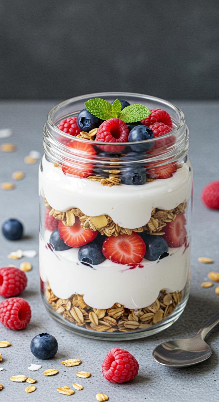 - In a glass or bowl, layer the Greek yogurt, berries, and granola.