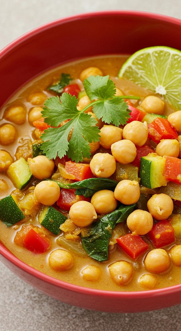 - Add chickpeas, coconut milk, and broth; simmer for 20 minutes.