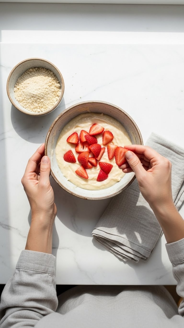 - Fold strawberries gently into the batter to avoid bleeding color.