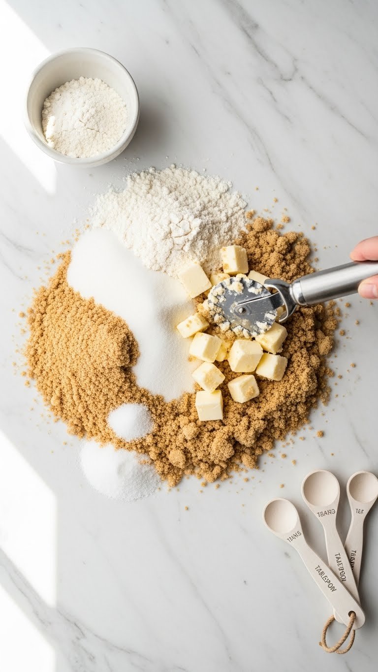 - Combine ½ cup flour, ⅓ cup granulated sugar, ¼ cup brown sugar, and ¼ tsp salt in a bowl.