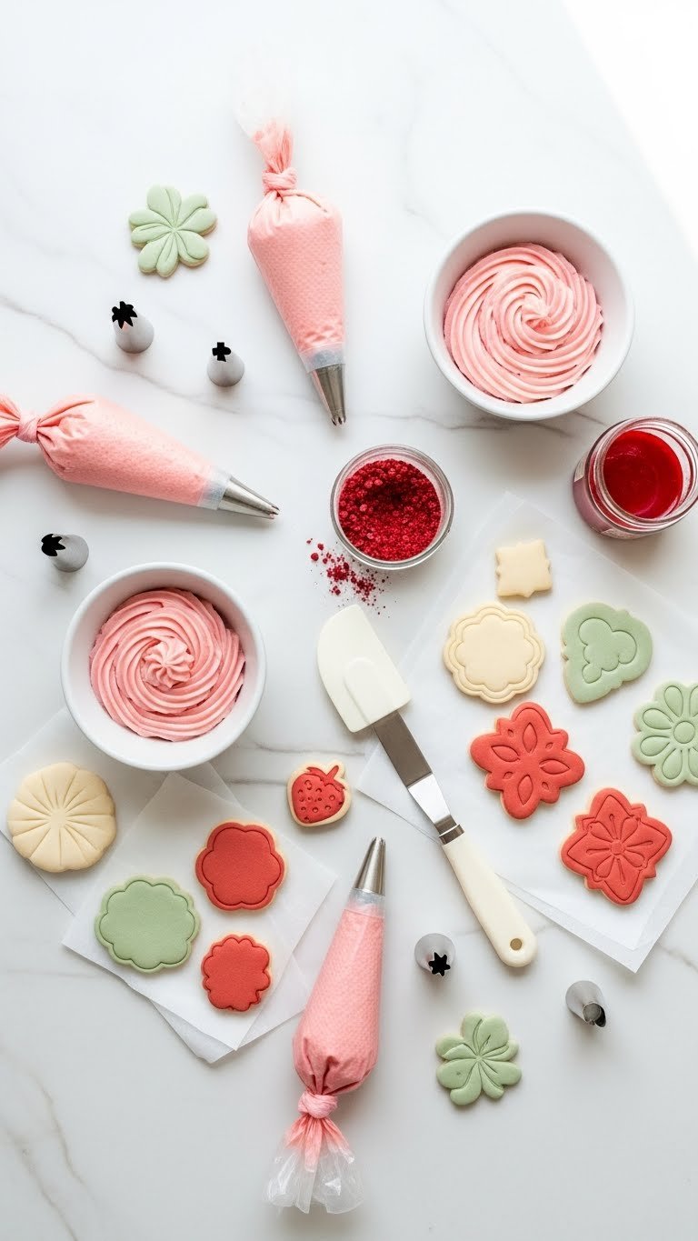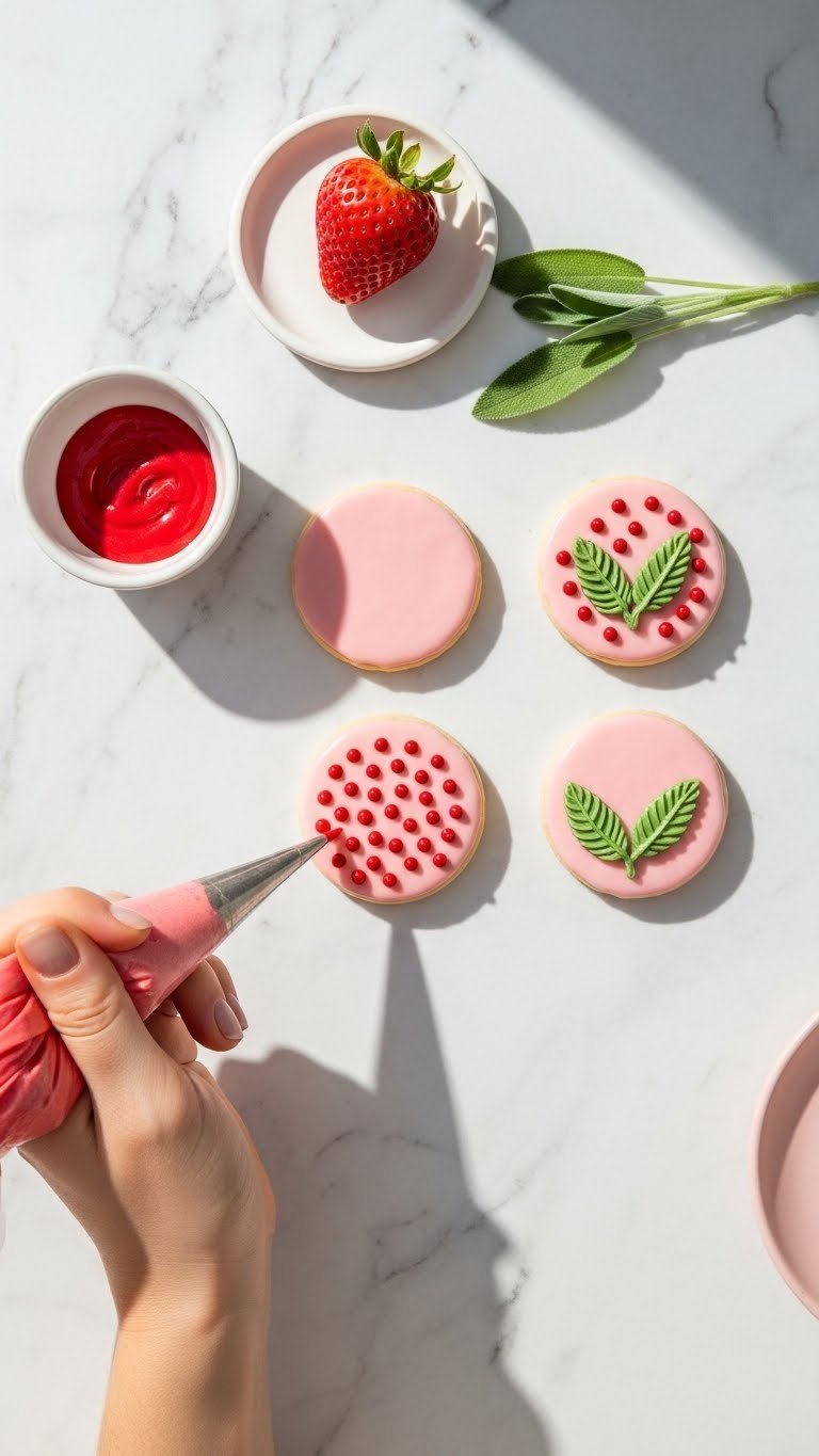 Follow these sequential steps to decorate strawberry cookies like a professional baker.