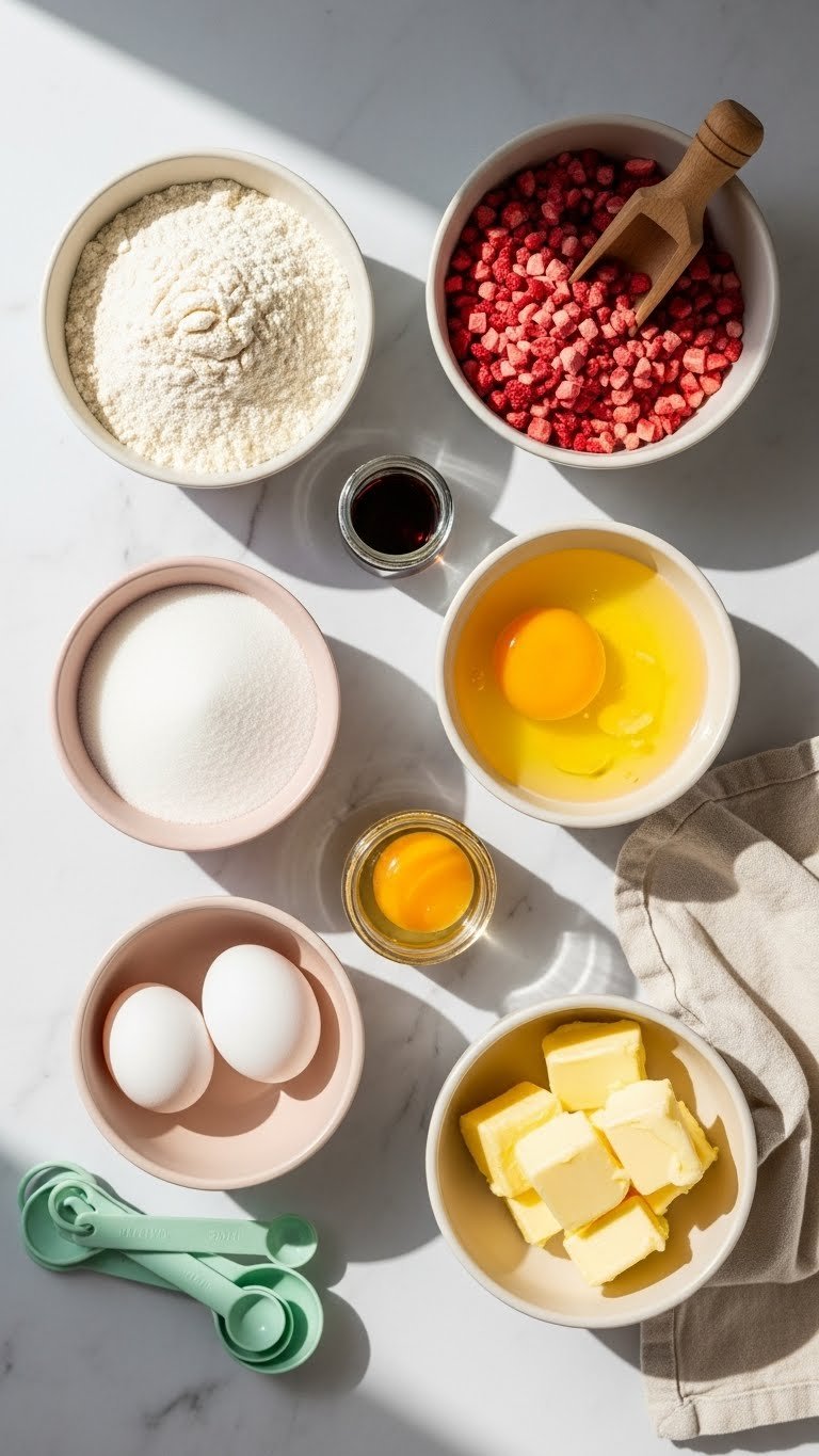 - Ingredients: 2 1/2 cups all‑purpose flour, 1 tsp baking soda, 1/2 tsp salt, 1 cup (225 g) butter, softened, 3/4 cup sugar, 3/4 cup brown sugar, 2 eggs, 1 tsp vanilla, 1 cup diced fresh or chopped freeze‑dried strawberries.