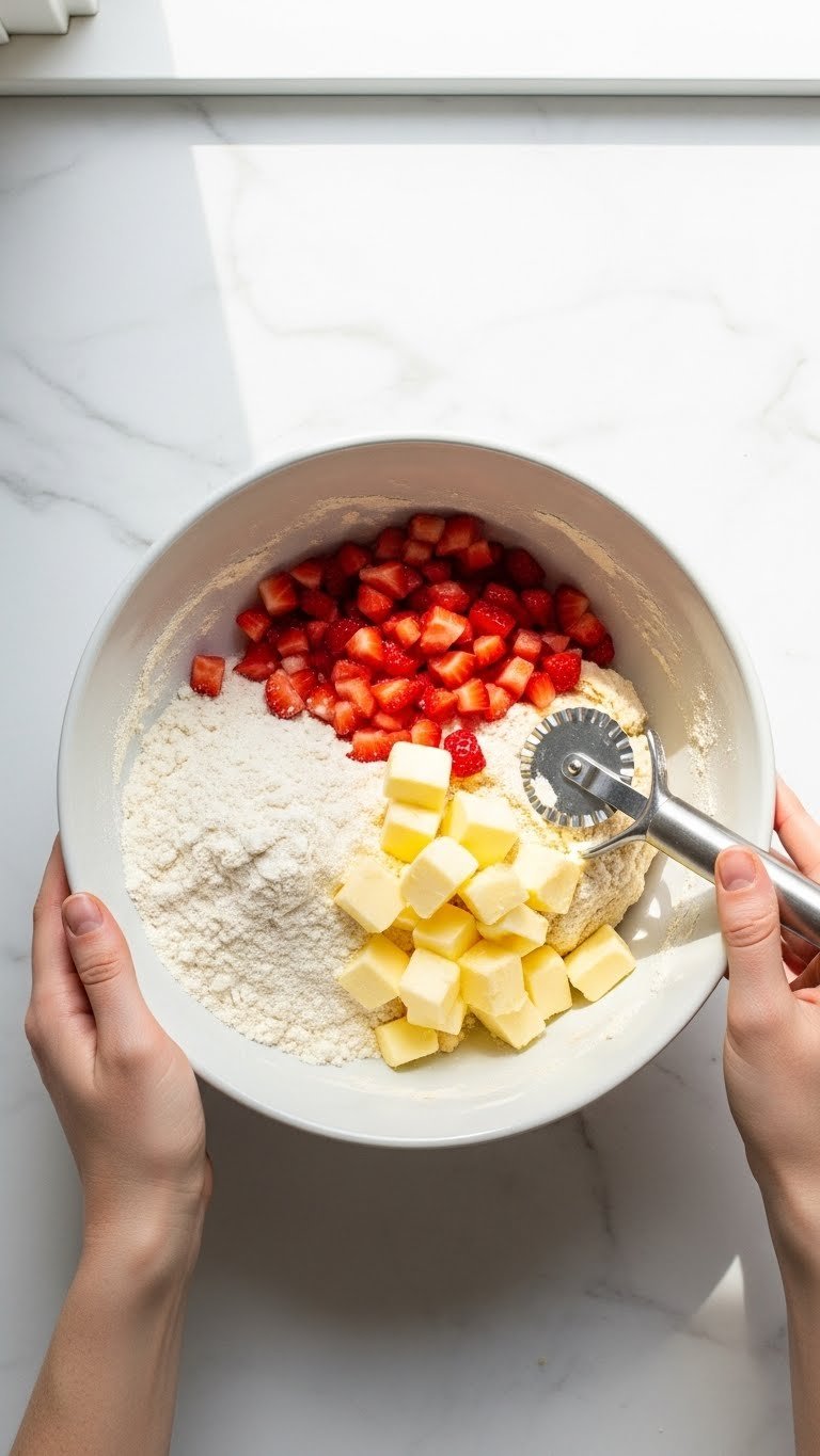 Pro tip: Toss strawberries in 1 tsp flour to keep them from bleeding into the dough.