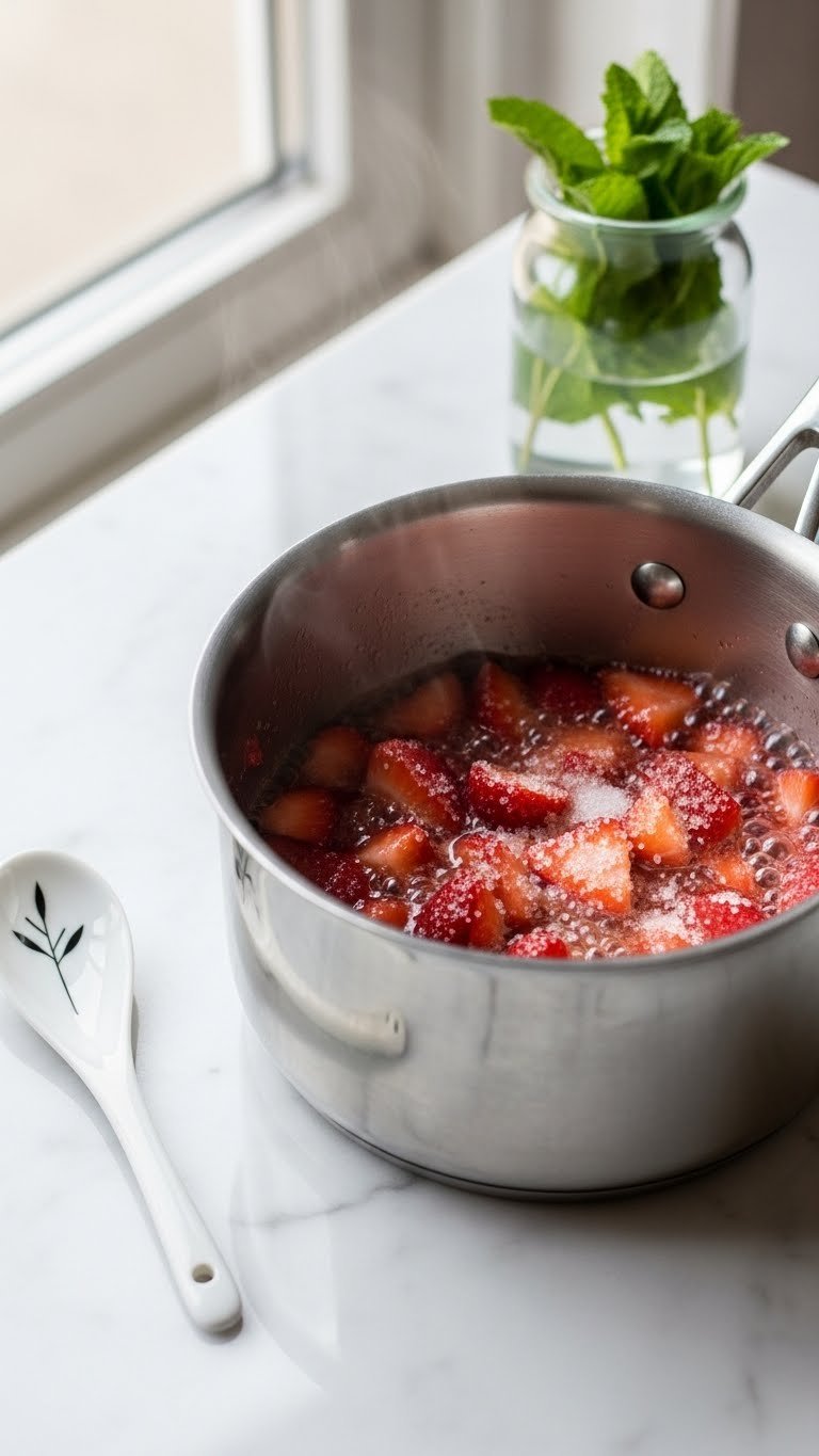 - Bring to a gentle simmer for 5–7 minutes, mashing strawberries as they soften.