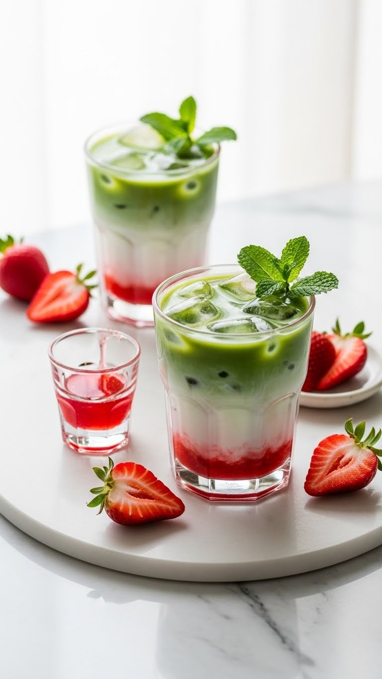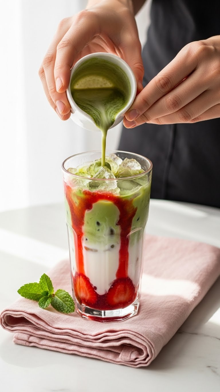 Serve immediately with a straw or tall spoon. Garnish with a thin strawberry slice on the rim or a light dusting of matcha for contrast. Make-ahead options: