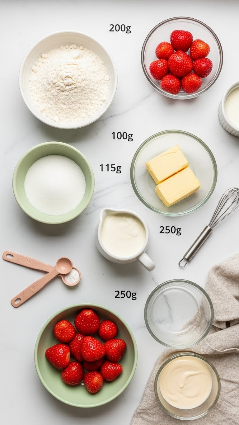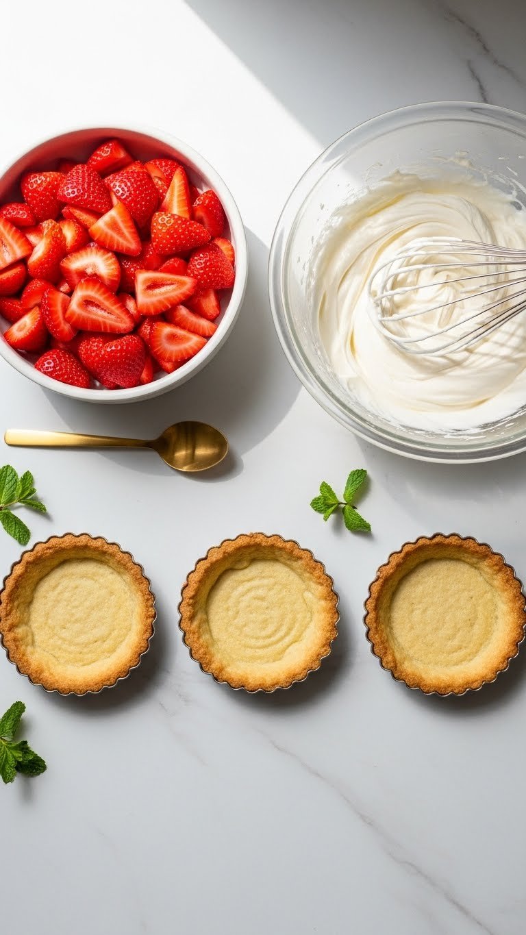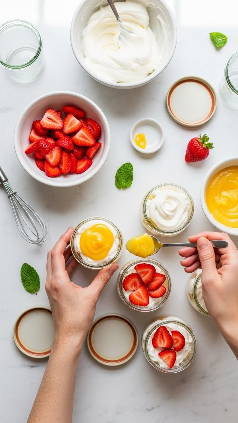 Prep saves time. Slice strawberries thinly so each mini dessert gets fruit in every bite. Whip cream to soft peaks with 75g powdered sugar — don't overwhip or it will split. If you're using lemon curd or pastry cream, chill it so layers hold.