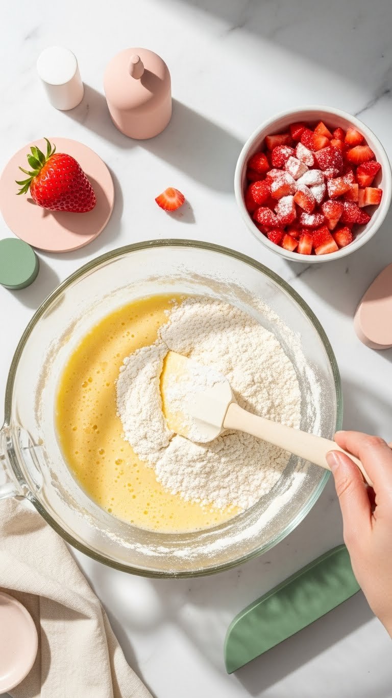 - Gently fold in the floured strawberries with 6–8 strokes. Over-folding releases gluten and dries muffins.