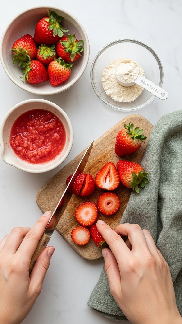 - Prep strawberries: Wash and hull 4–6 medium strawberries. Dice half and lightly mash the rest to release juices.