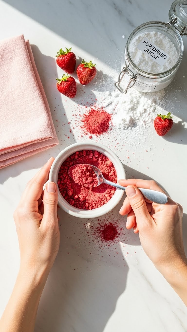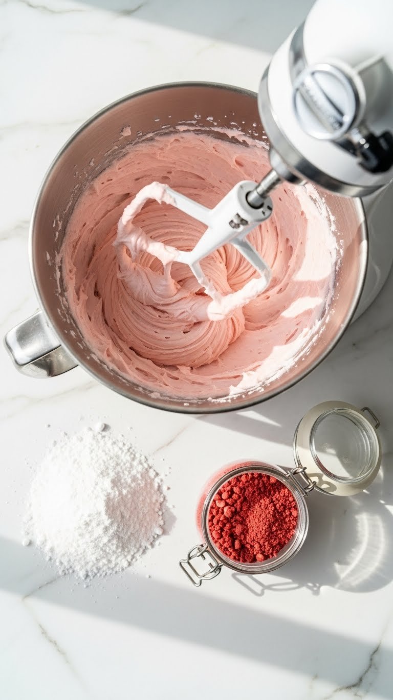 - Add flavor: Beat in 3 tbsp freeze-dried strawberry powder, 1 tsp vanilla, and a pinch of salt.