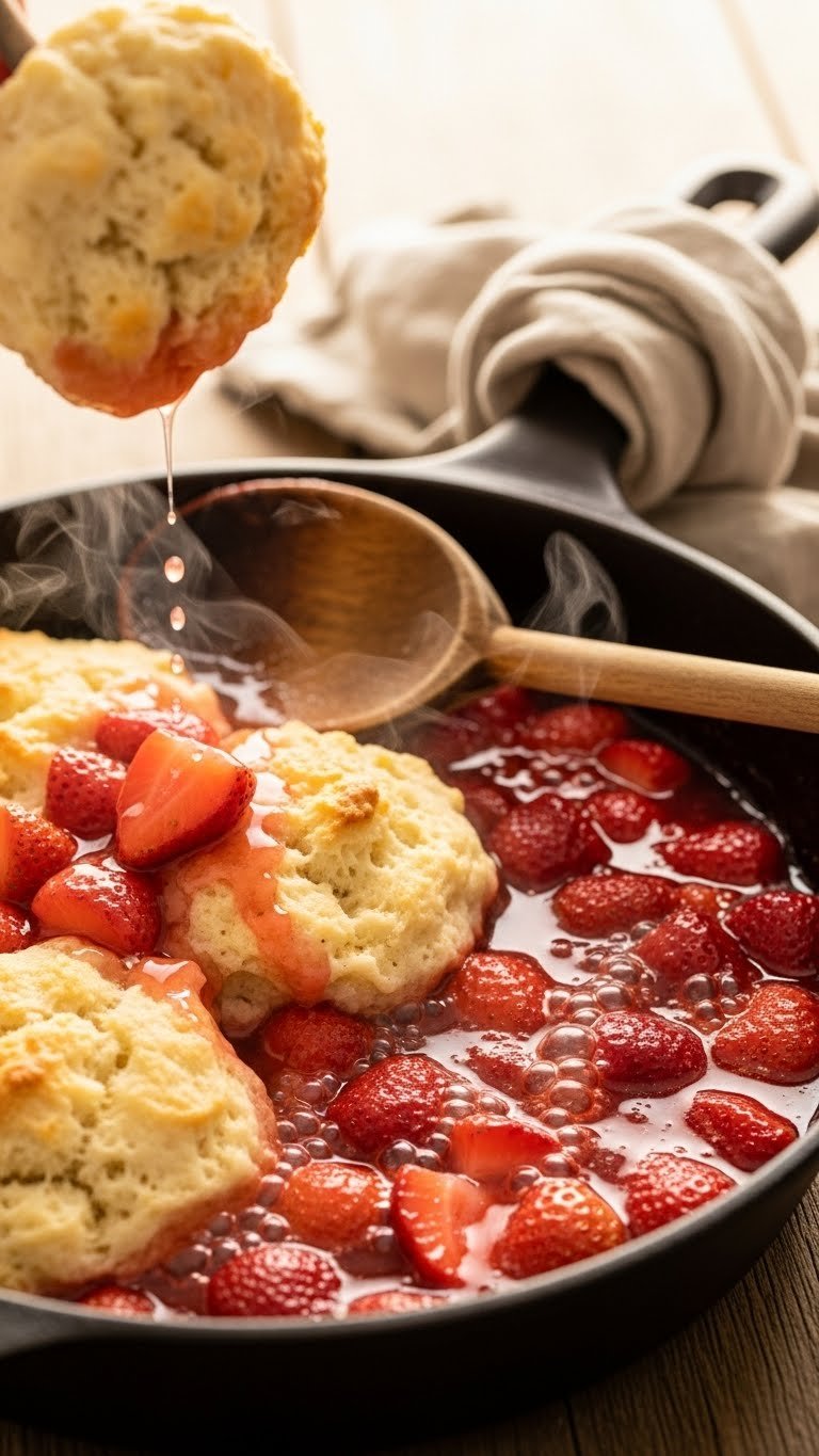 Quick tip: swap to store-bought biscuit dough for a faster shortcut. Use frozen strawberries (thawed and drained) if fresh aren’t available.