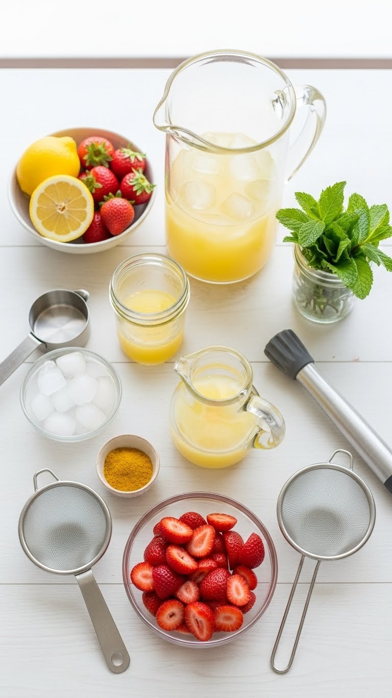 - Pitcher, blender or muddler, fine mesh sieve, measuring cups, citrus juicer