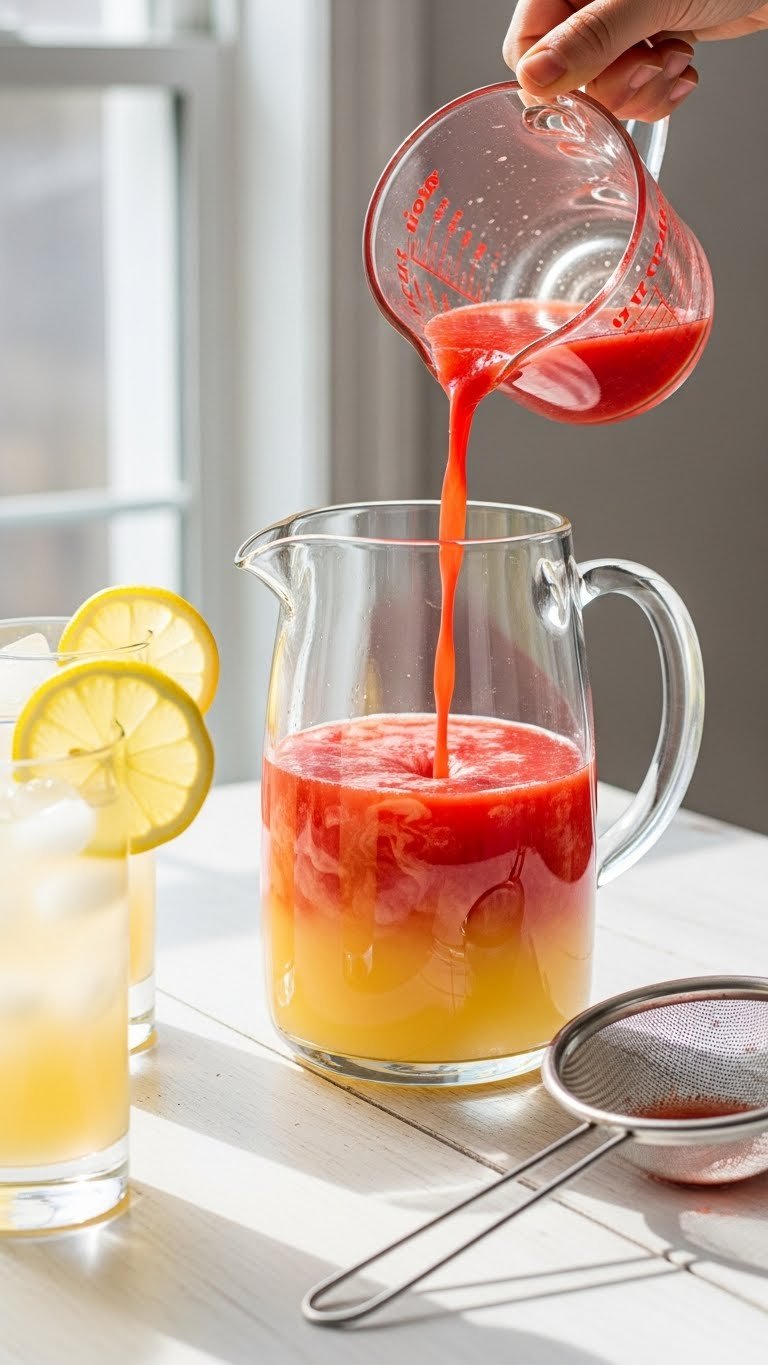 - Strain macerated strawberries through a sieve, pressing to extract juice. Add juice to the pitcher.