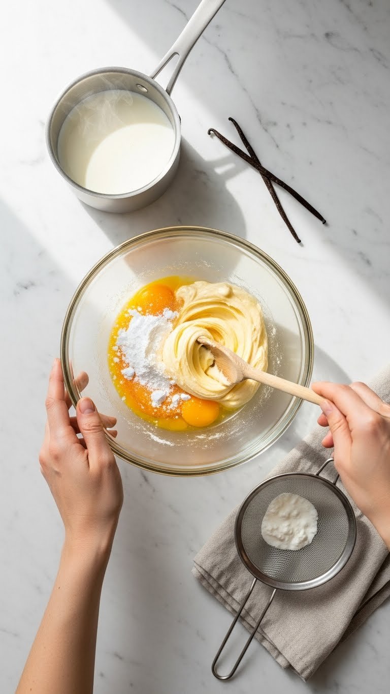 Make the pastry cream first so it cools while you bake. Heat 500 ml milk with half the sugar until it’s steaming, not boiling. Whisk 4 egg yolks with 40 g cornstarch and remaining sugar until pale.