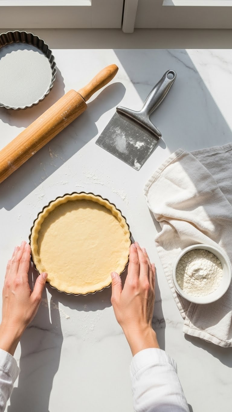 - Roll chilled dough to 3 mm thickness on a lightly floured surface. Gently press into a 9-inch tart pan and trim edges.