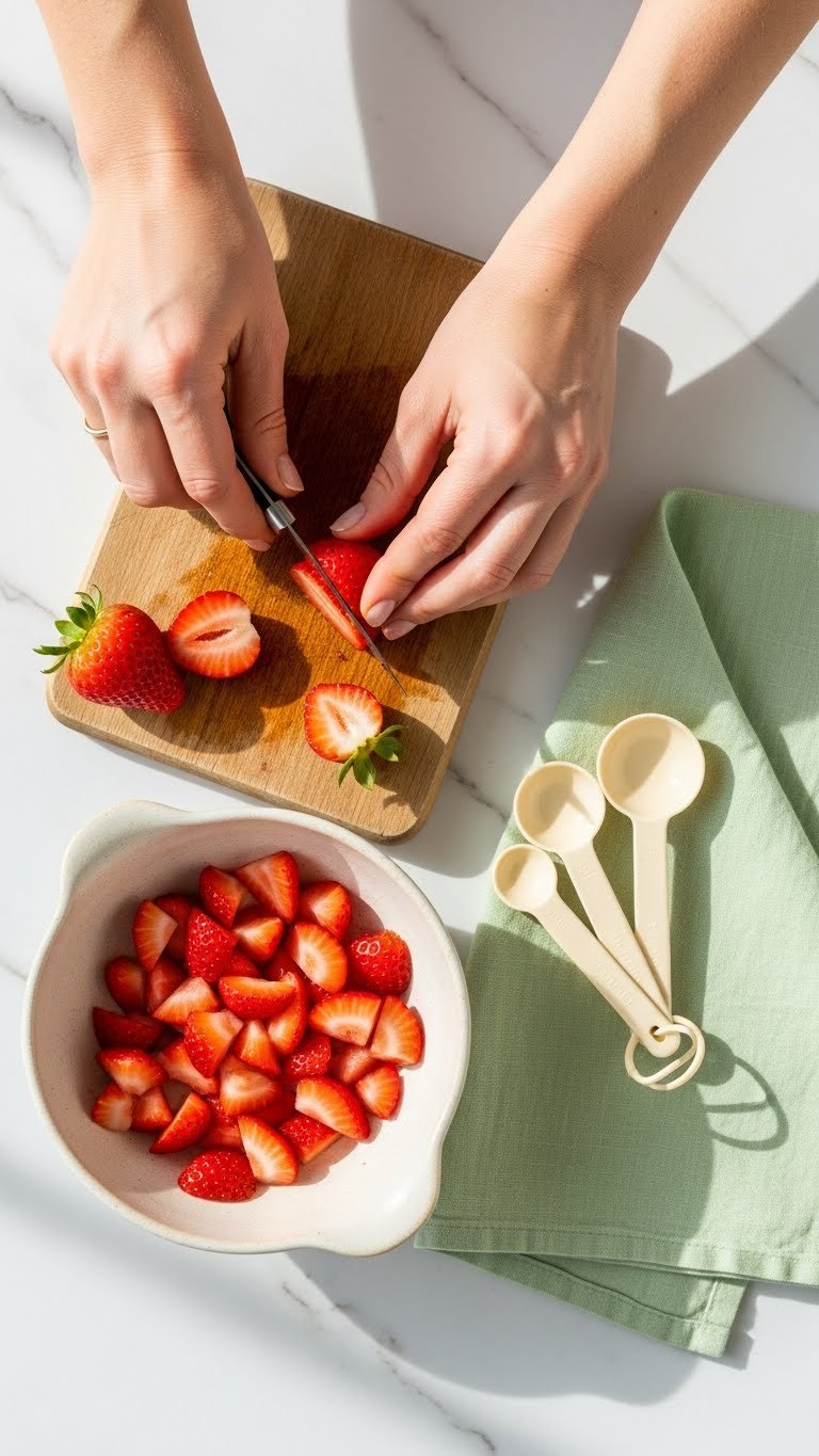 - Rinse berries gently and pat dry. Remove stems and hull with a paring knife.