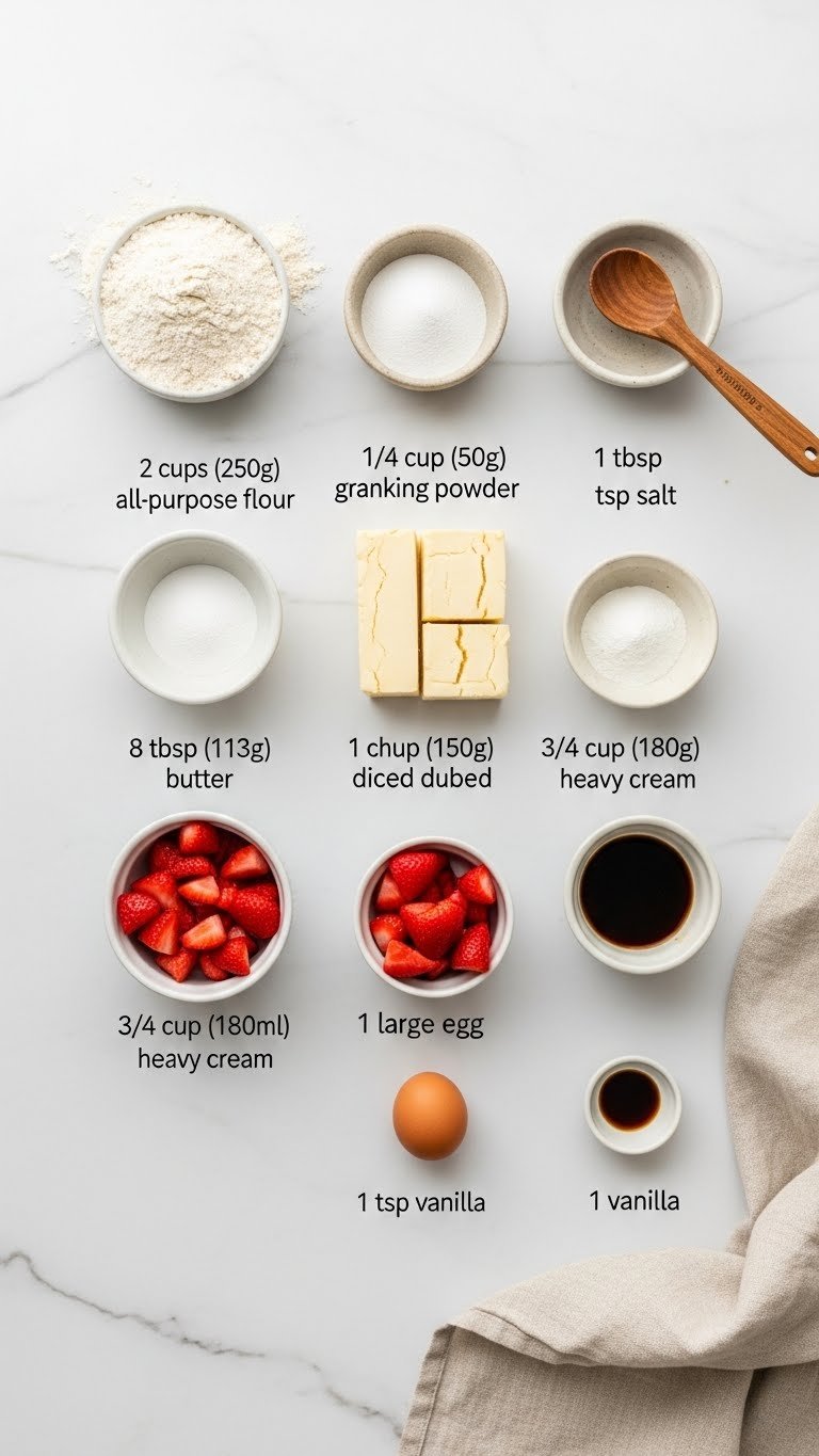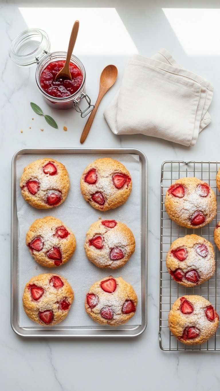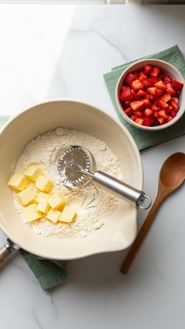 Keep everything cool. Work quickly so the butter stays in small pea-sized pieces—this yields flaky layers and even rise. Fold in the strawberries gently; large chunks add moisture and can make shapes slump.