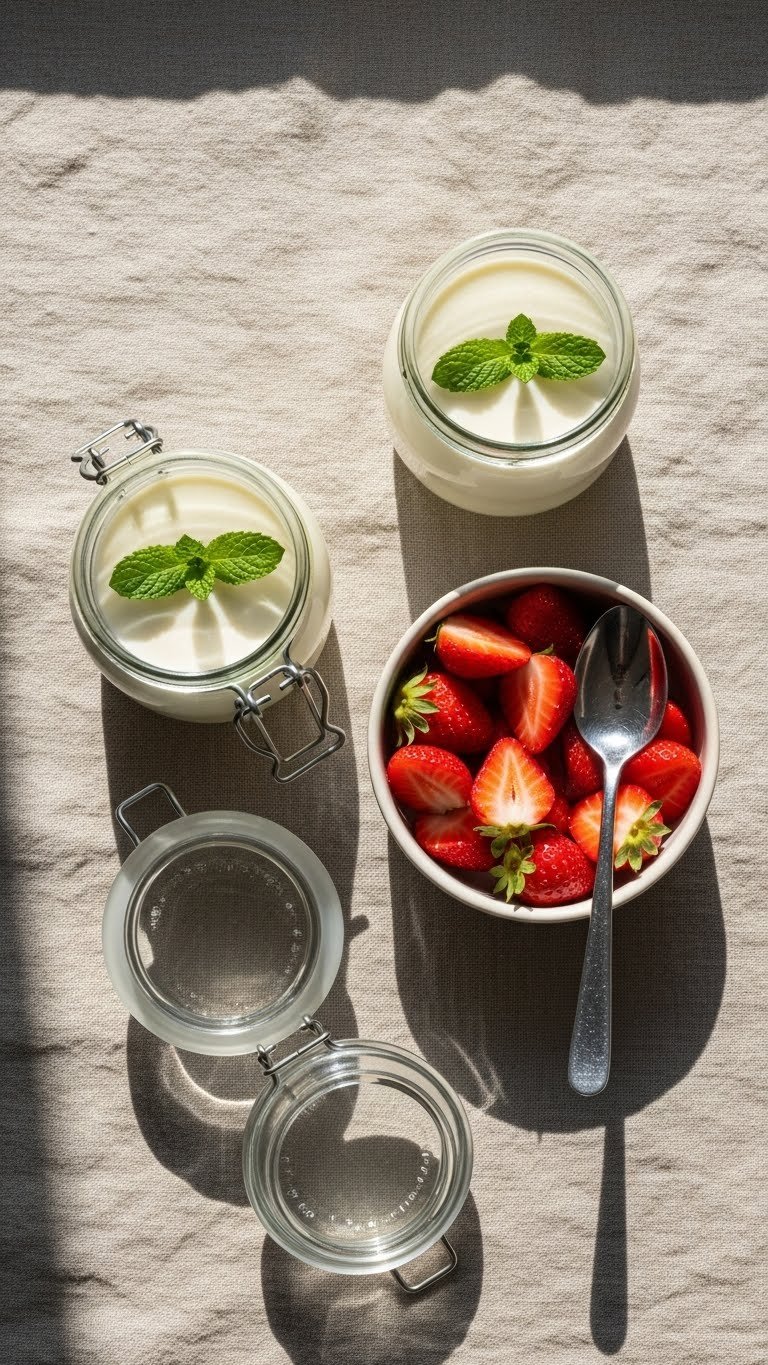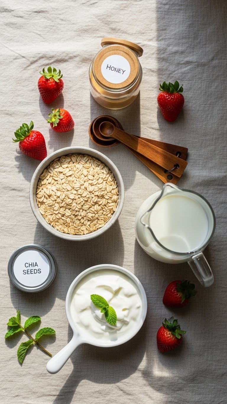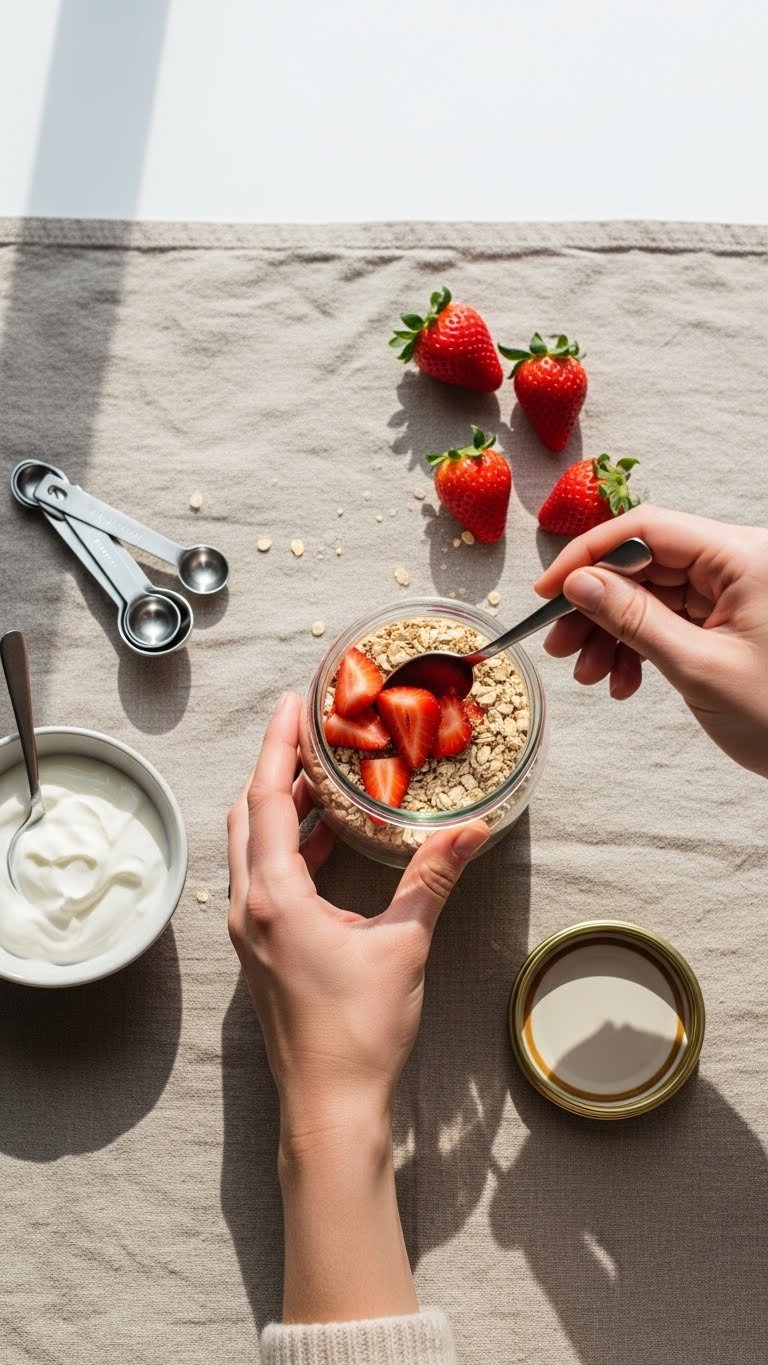 Why this matters: the right jar and measured ratio keep oats hydrated but not mushy, and separate toppings protect strawberry texture.