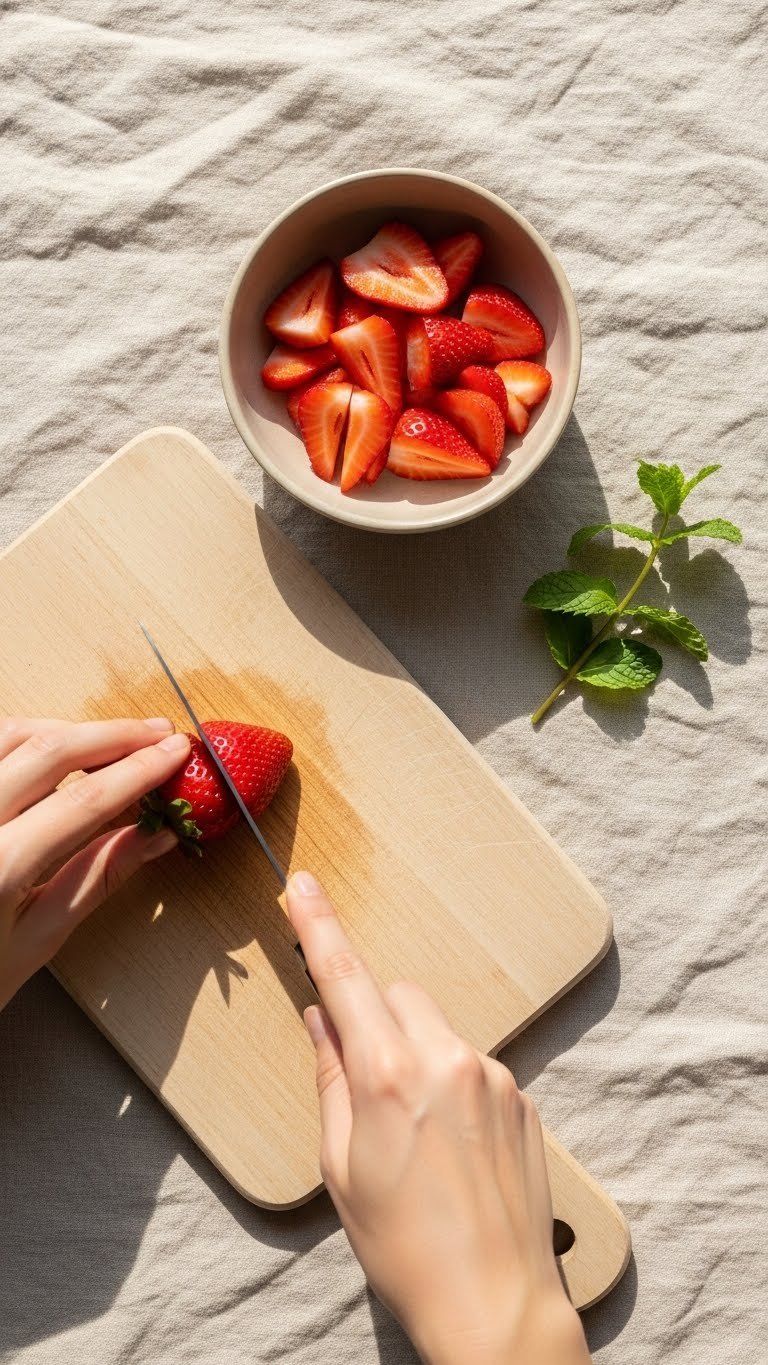 - Add reserved toppings like sliced strawberries, granola, or nut butter last for crunch.