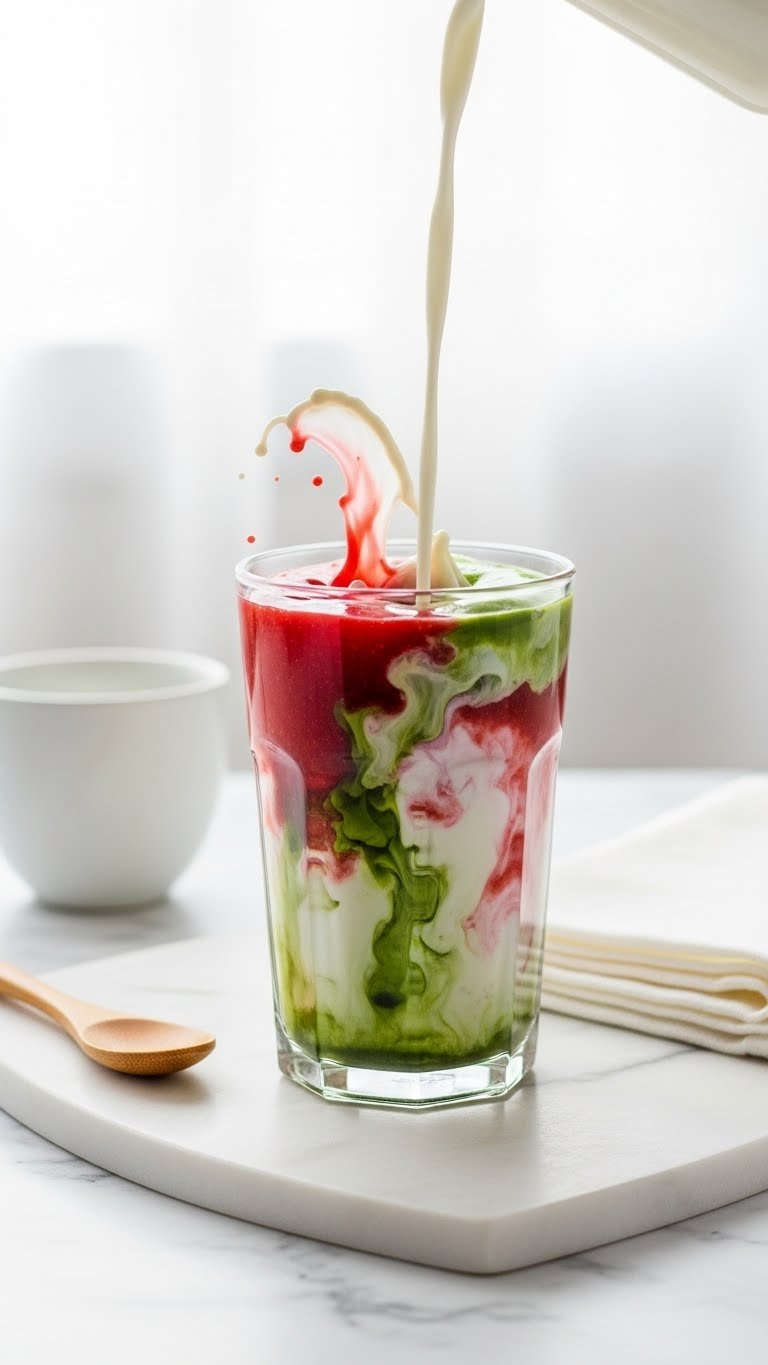 - Add ice (optional), then pour 1/2–1 cup cold milk over the matcha and strawberry.