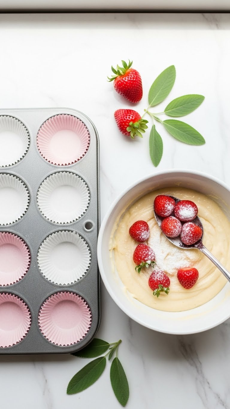 - Spoon batter into tins, then press a few berry pieces on top for a fresh look.