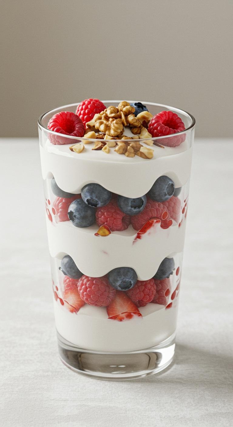 - Layer Greek yogurt, berries, and nuts in a glass.