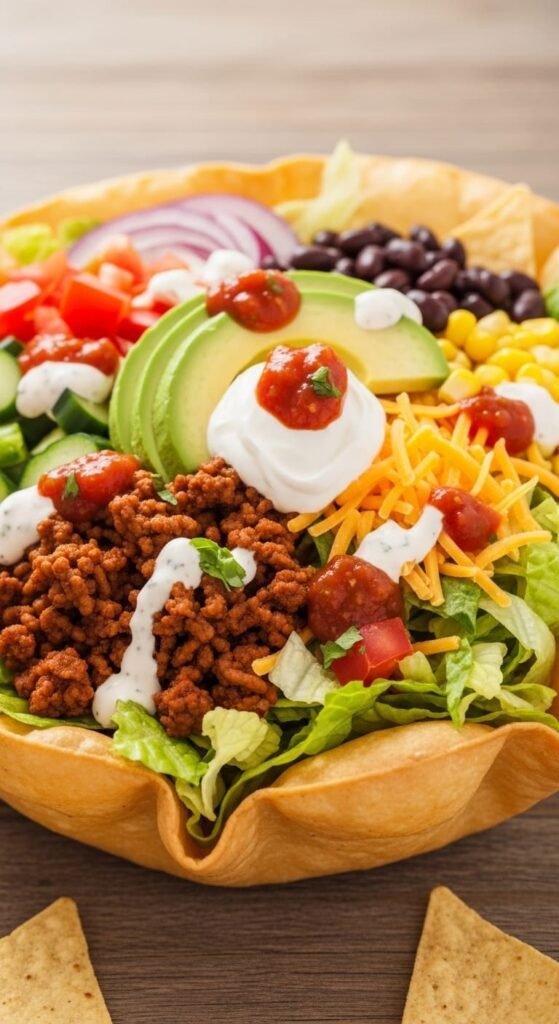 (Image Prompt: A colorful taco salad in a large bowl, featuring taco-seasoned ground beef, lettuce, tomatoes, cheese, and guacamole, all beautifully arranged. The vibrant ingredients jump out against the bowl’s backdrop.)