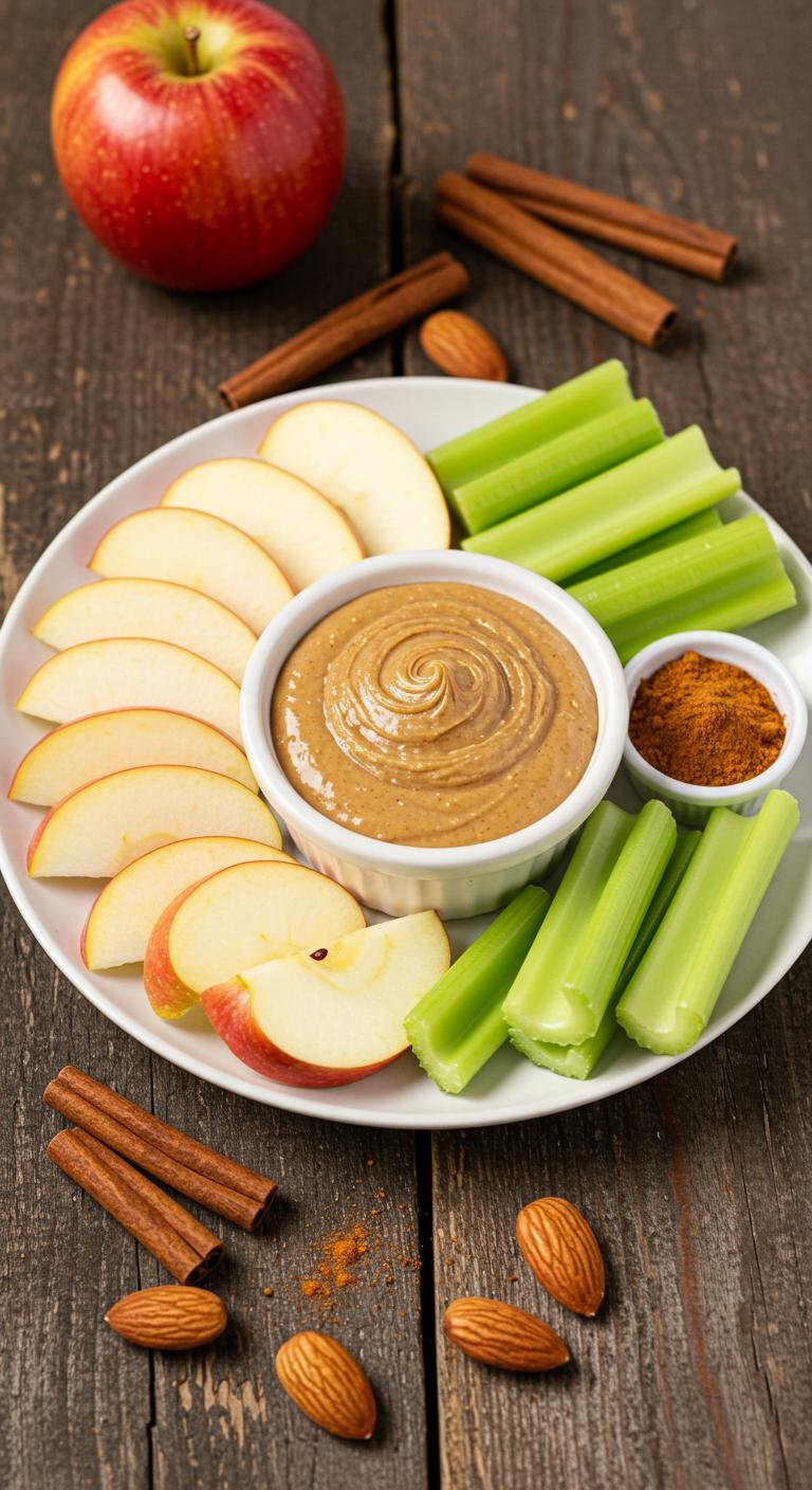 (Image Prompt: A delightful snack plate featuring almond butter in a small bowl, surrounded by apple slices, celery sticks, and a sprinkle of cinnamon, all on a rustic wooden background.)