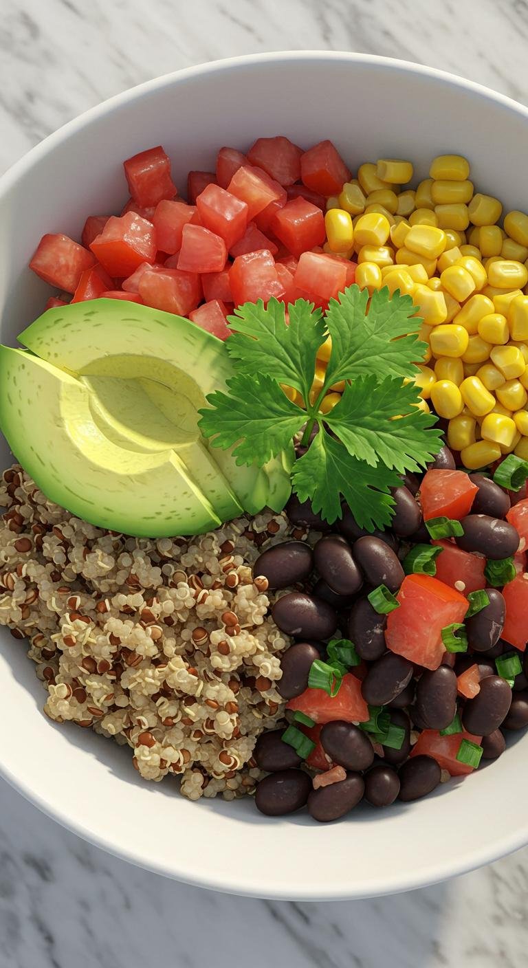 (Image Prompt: A hearty quinoa and black bean bowl with corn, diced tomatoes, avocado, and cilantro, beautifully arranged for a colorful and appealing presentation.)