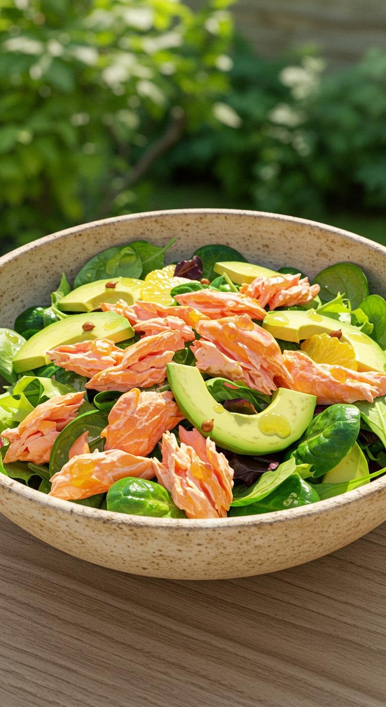 (Image Prompt: A bright and inviting bowl of salmon salad featuring flaked salmon, ripe avocado, mixed greens, and a citrus vinaigrette, showcasing fresh ingredients in a natural setting.)