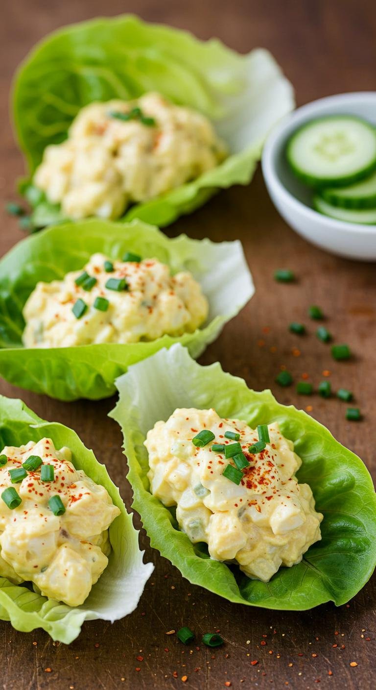 (Image Prompt: A clean, minimalist shot of lettuce cups filled with creamy egg salad, garnished with chives and paprika, all set against a rustic background. A side of sliced cucumbers adds a refreshing touch.)