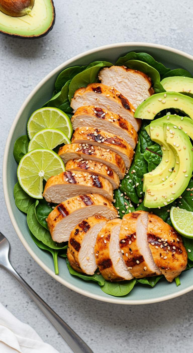 (Image Prompt: A vibrant serving bowl filled with grilled chicken slices and avocado nestled on a bed of leafy greens, topped with a sprinkle of sesame seeds and lime wedges.)