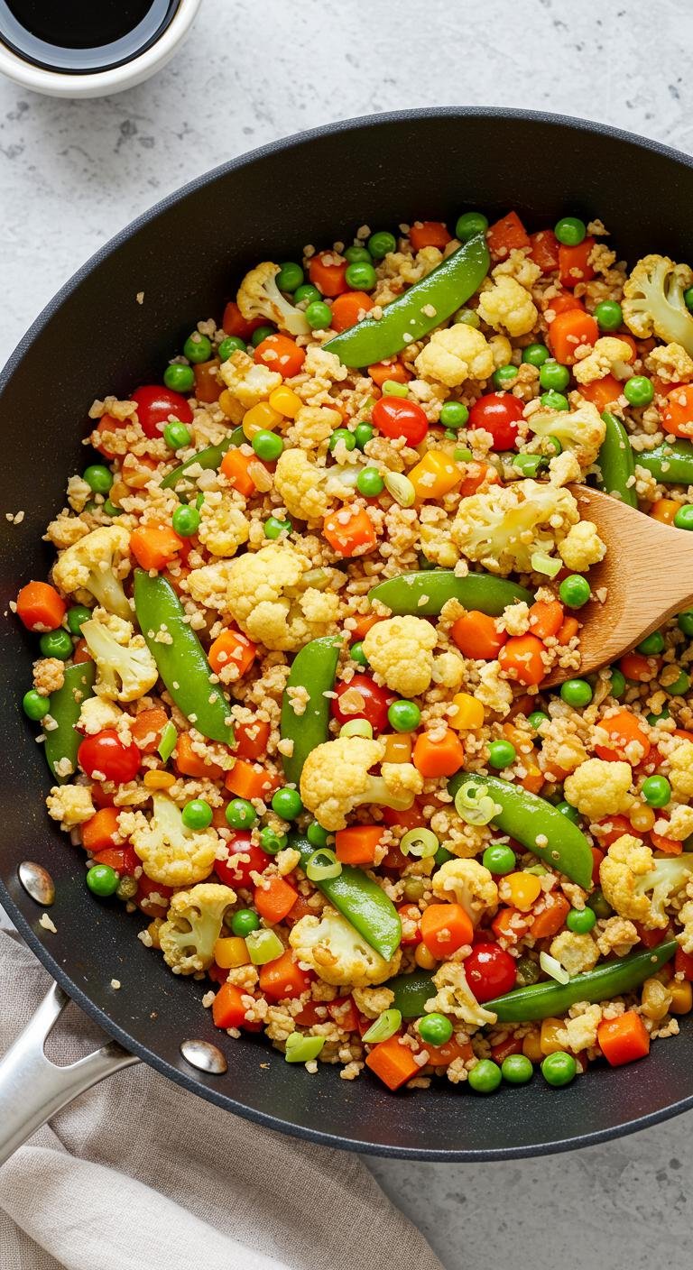 (Image Prompt: A colorful dish of cauliflower fried rice, featuring vibrant vegetables like peas, carrots, and bell peppers, all stir-fried in a sleek black skillet. A light soy sauce adds a glossy finish.)
