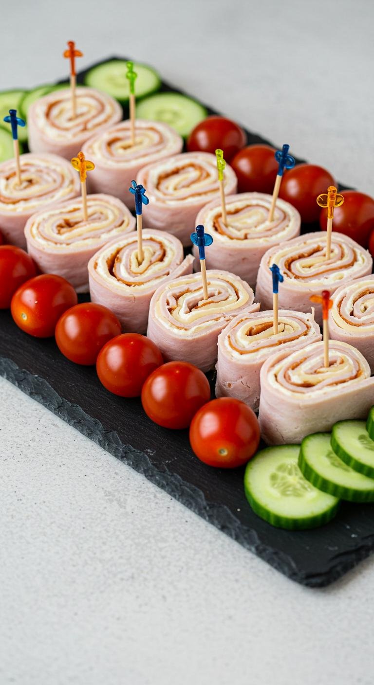 (Image Prompt: A platter showcasing turkey and cheese roll-ups, neatly arranged with toothpicks, surrounded by vibrant cherry tomatoes and cucumber slices.)