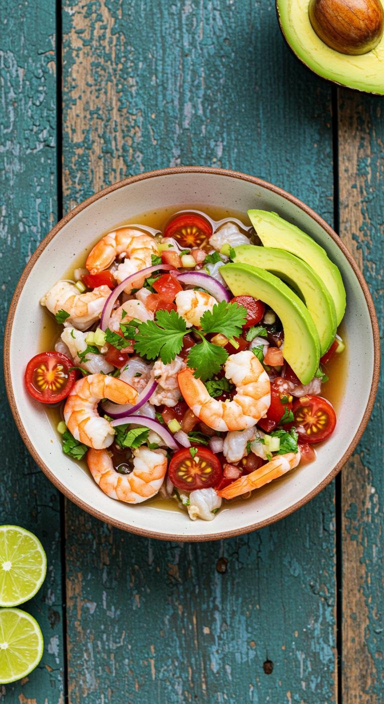 (Image Prompt: A vibrant bowl of shrimp ceviche, filled with chopped shrimp, tomatoes, lime juice, and cilantro, all garnished with avocado slices. The dish is served on a rustic wooden table.)