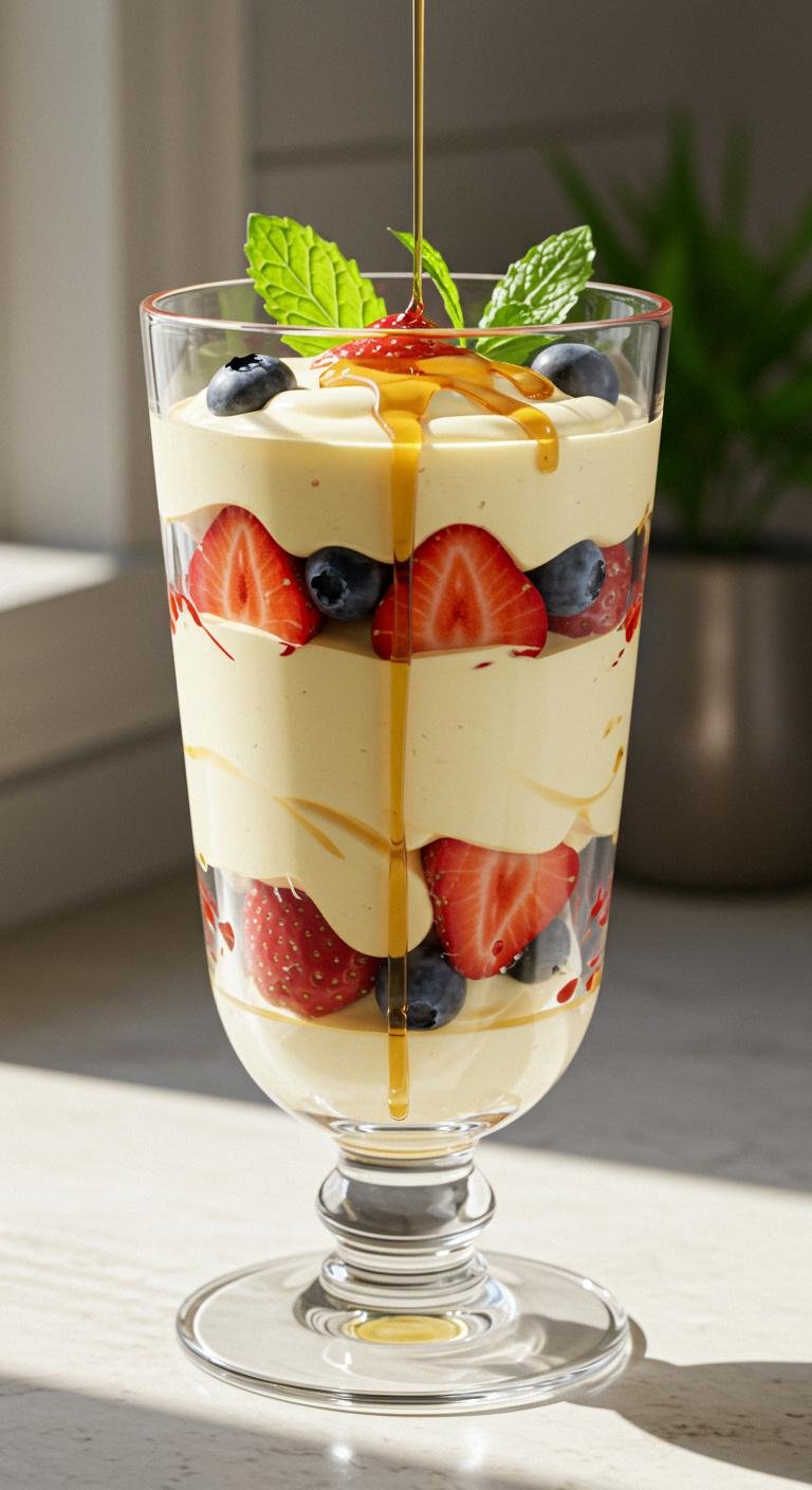 - In a glass, layer yogurt, berries, and a drizzle of syrup.