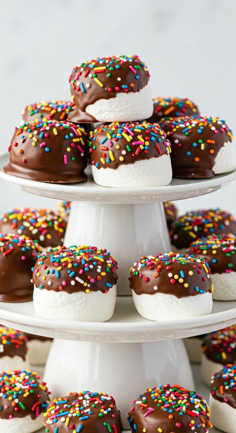 - Dip marshmallows halfway in the chocolate, then sprinkle with your choice.