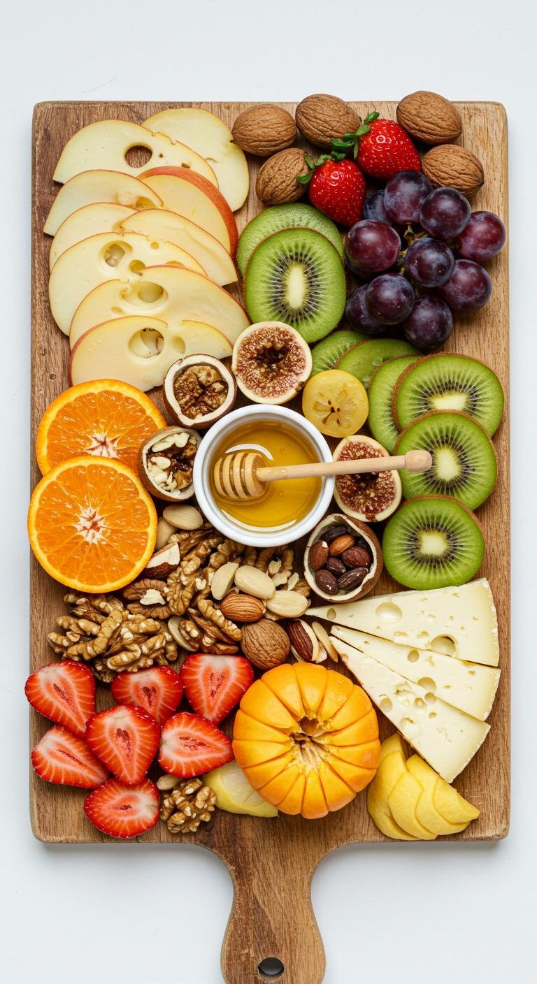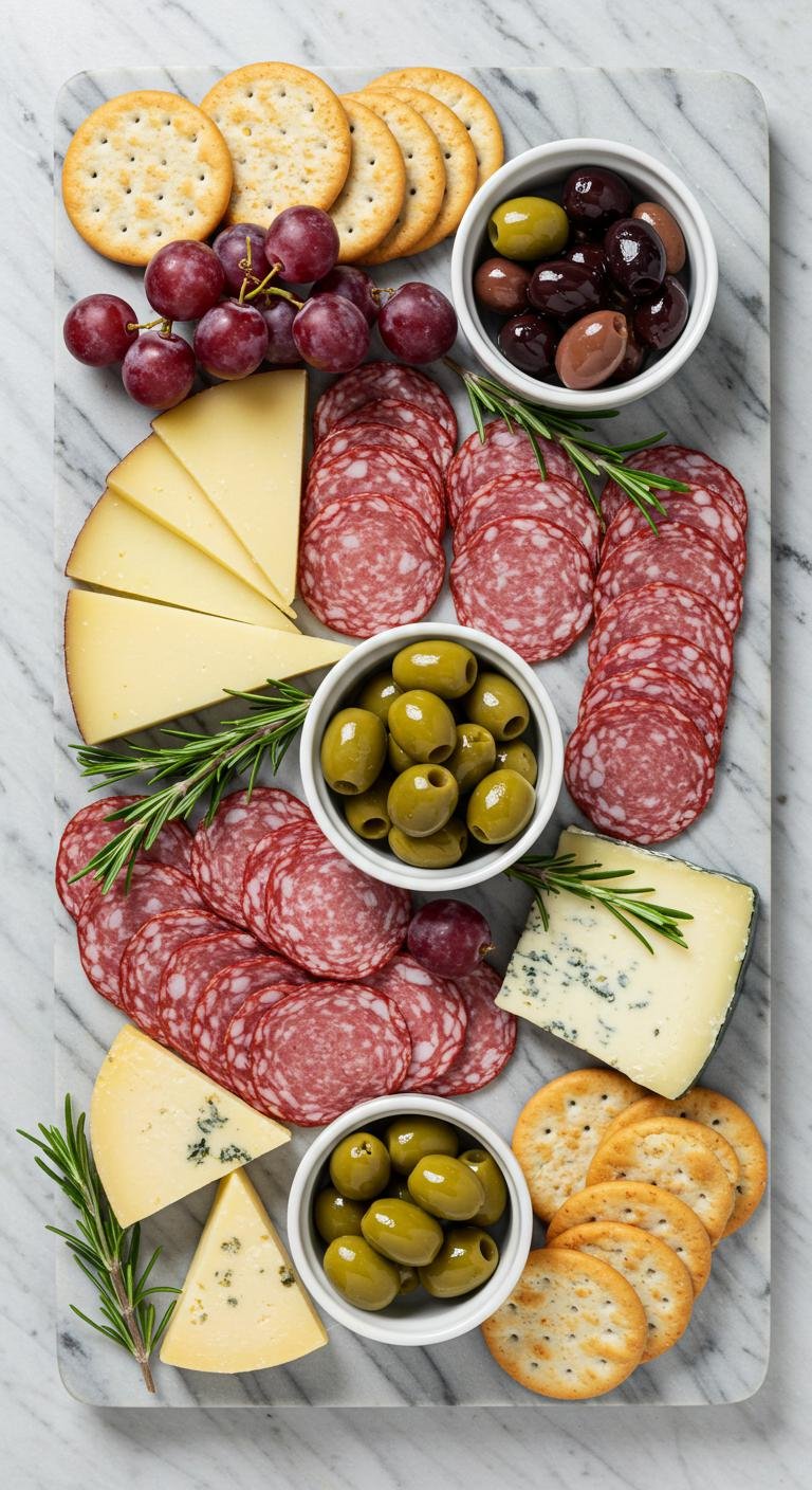 - Fill in gaps with olives, crackers, and sliced fruits.