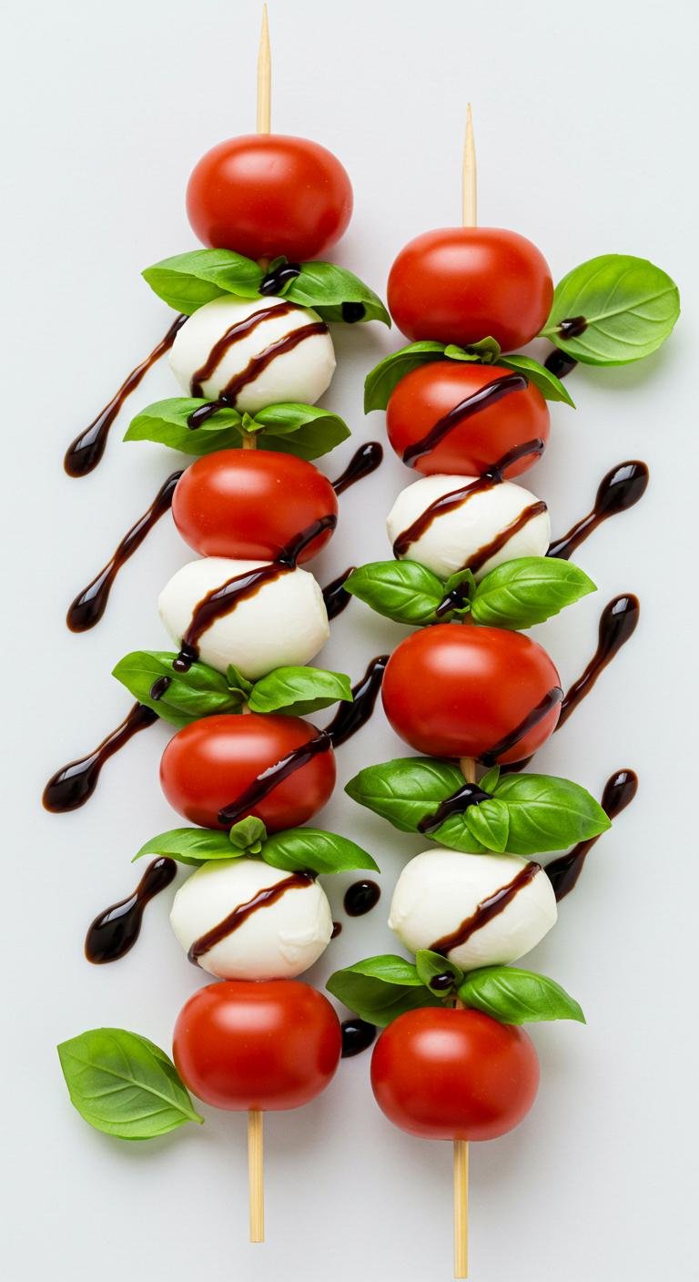 - Skewer a tomato, basil, and mozzarella onto toothpicks.