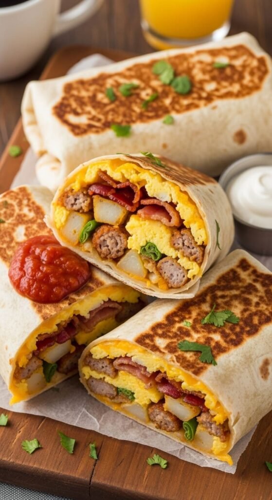 - Place egg mixture in tortillas and sprinkle with cheese. Roll them up.