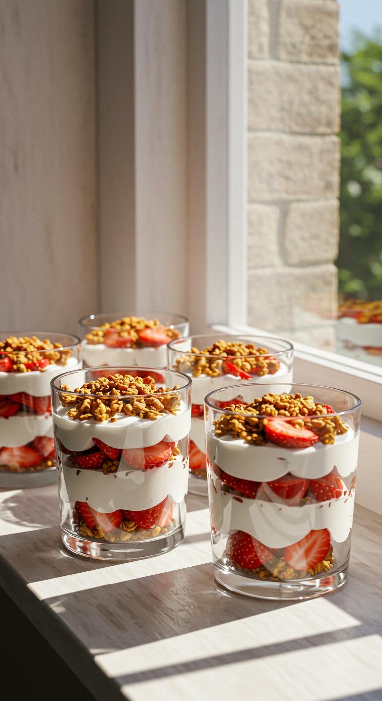 - In glasses, layer yogurt, a layer of berries, and granola.