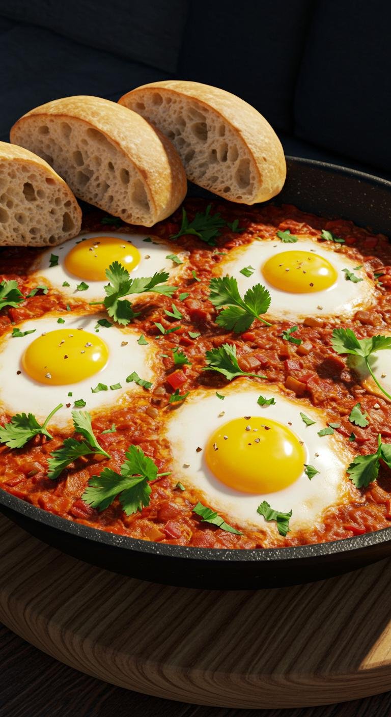 - Make wells in the sauce and crack eggs into them. Cover and cook until eggs are set.