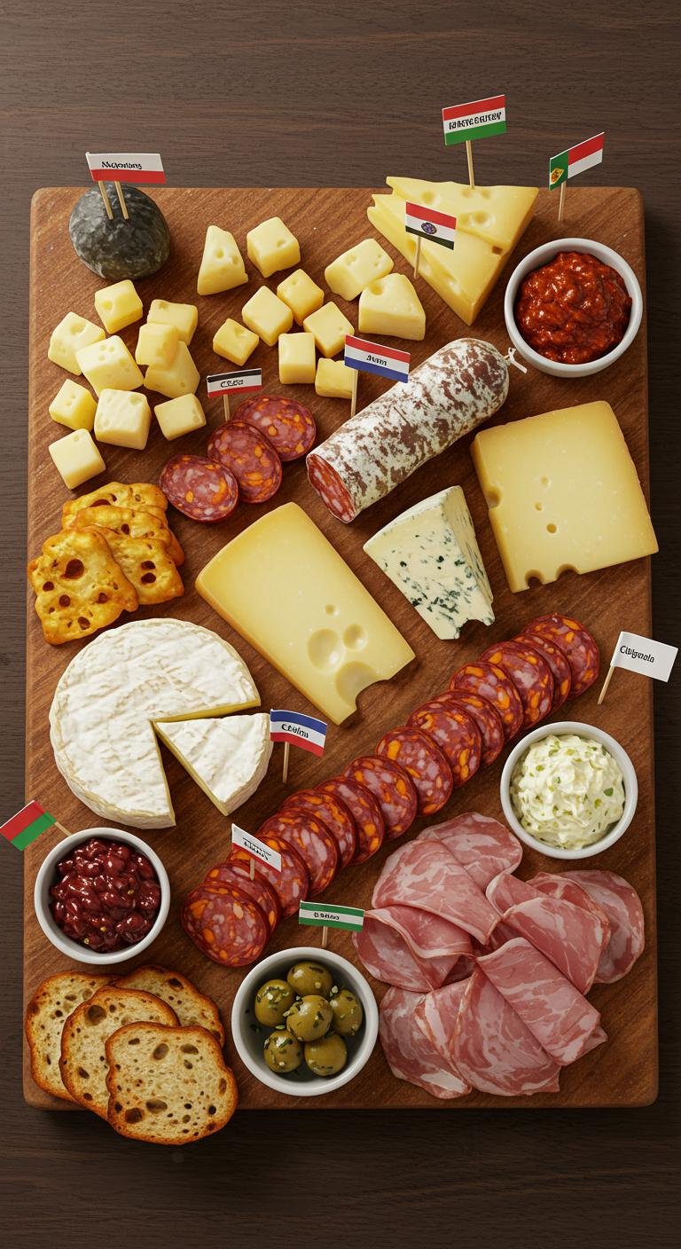 - Arrange cheeses and meats showcasing their origins with flags.
