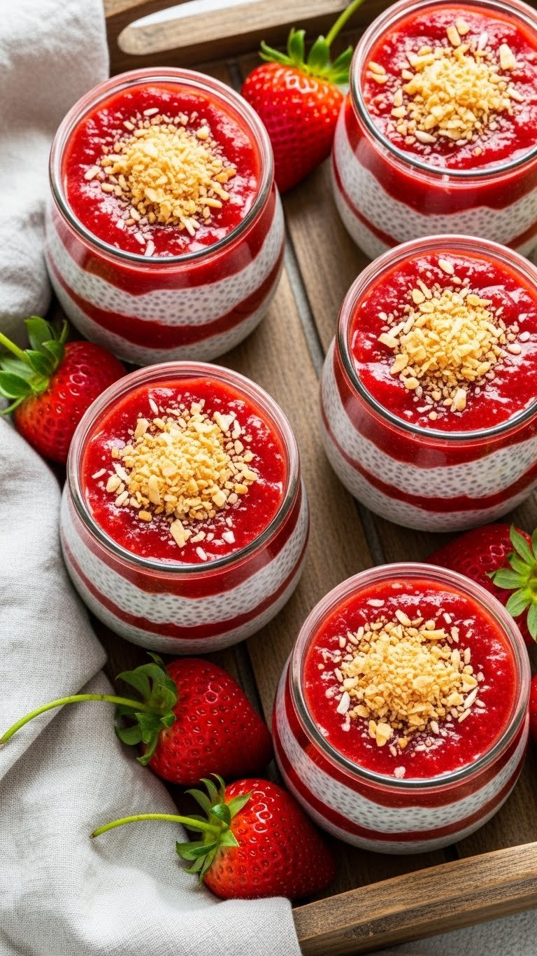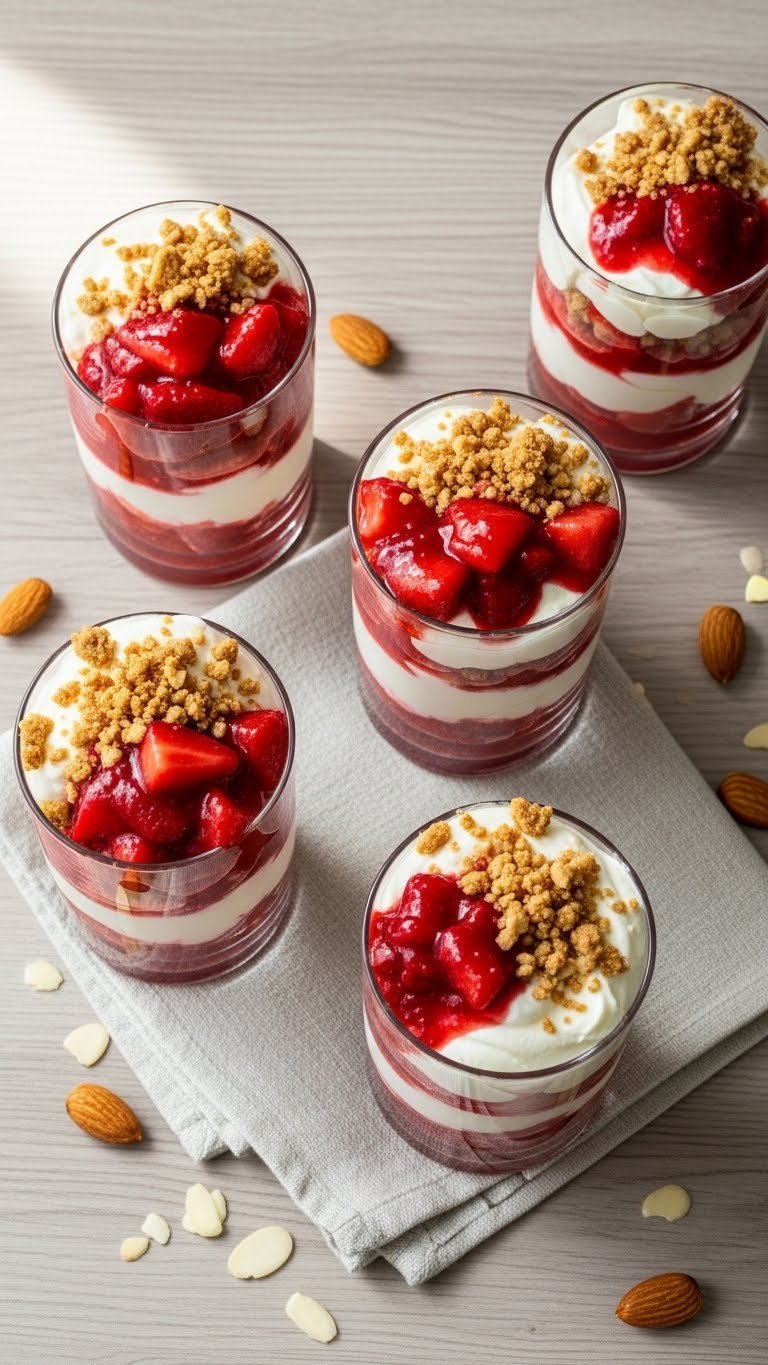 Silky mascarpone gives these parfaits a rich, slightly tangy base. Layers of strawberry compote and almond crumble add texture and brightness. They’re elegant yet easy for dinner parties. If you love creamy Italian flavors with fresh fruit, this is for you. Every spoon reveals smooth, sweet, and crunchy contrasts.