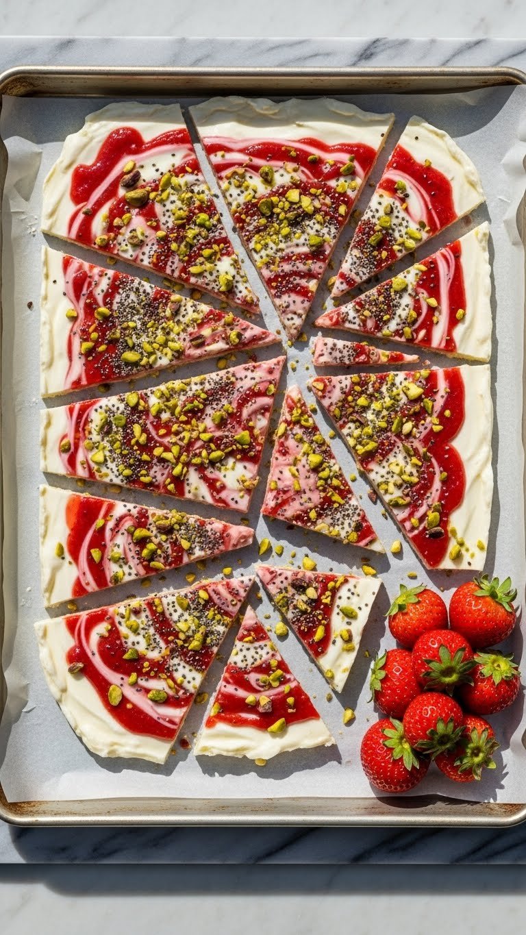 This frozen yogurt bark is cool, tangy, and studded with fresh strawberry bits. It’s quick to spread and freeze, and breaks into crunchy-silky shards. Great for snackers and kids who want a handheld treat. The texture is creamy with icy snap and juicy strawberry pockets. You’ll smell bright fruit and yogurt as it chills.